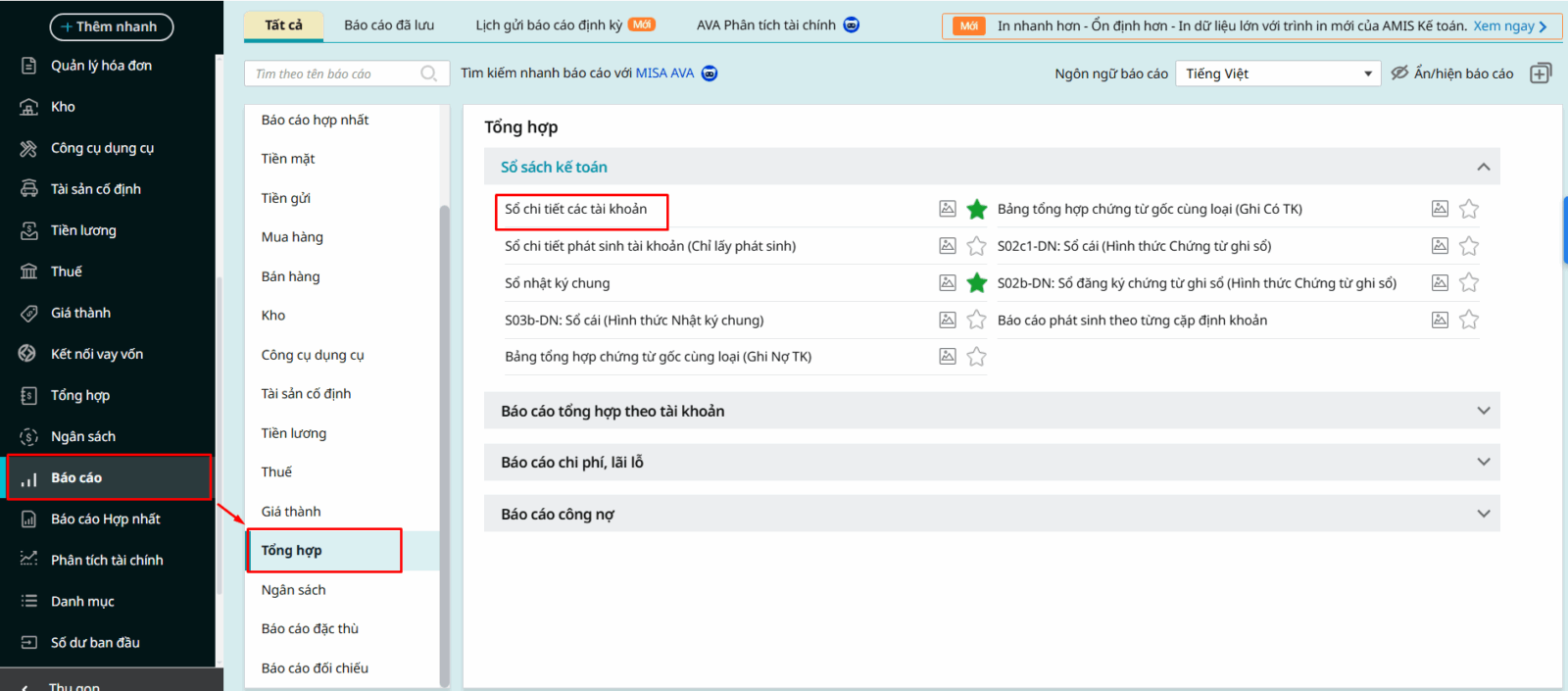 Bước 2: Vào mục Báo cáo\Tổng hợp\Sổ chi tiết các tài khoản để mở sổ chi tiết các tài khoản này.