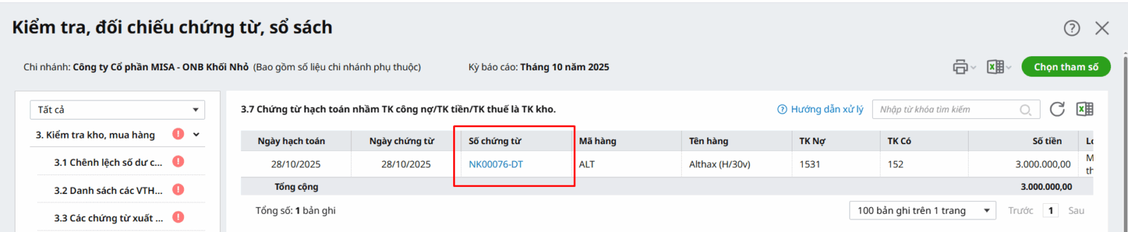 Bước 1: Trên báo cáo khi kiểm tra đối chiếu chứng từ sổ sách, nhấn vào Số chứng từ để mở chứng từ chi tiết lên kiểm tra.