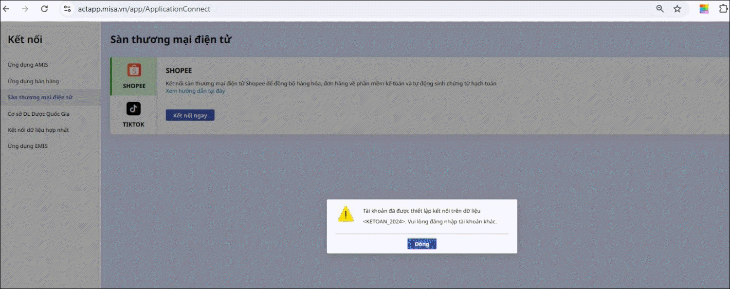 Nguyên nhân: Một tài khoản Shopee chỉ được kết nối trên một dữ liệu kế toán. Tài khoản Shopee này đã được kết nối ở một dữ liệu khác => khi kết nối ở dữ liệu hiện tại phần mềm sẽ báo lỗi