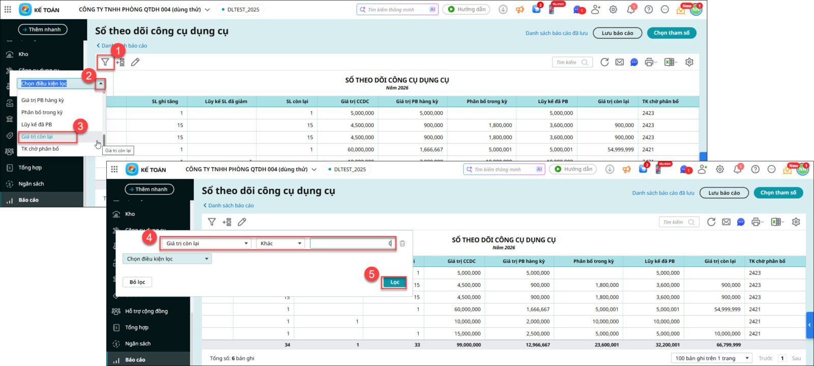 • Đối với Sổ theo dõi CCDC: nhấn vào biểu tượng hình phễu Lọc \ nhấn mũi tên Chọn điều kiện lọc là Giá trị còn lại \ chọn điều kiện lọc là Khác \ nhập giá trị lọc là 0 \ nhấn Lọc