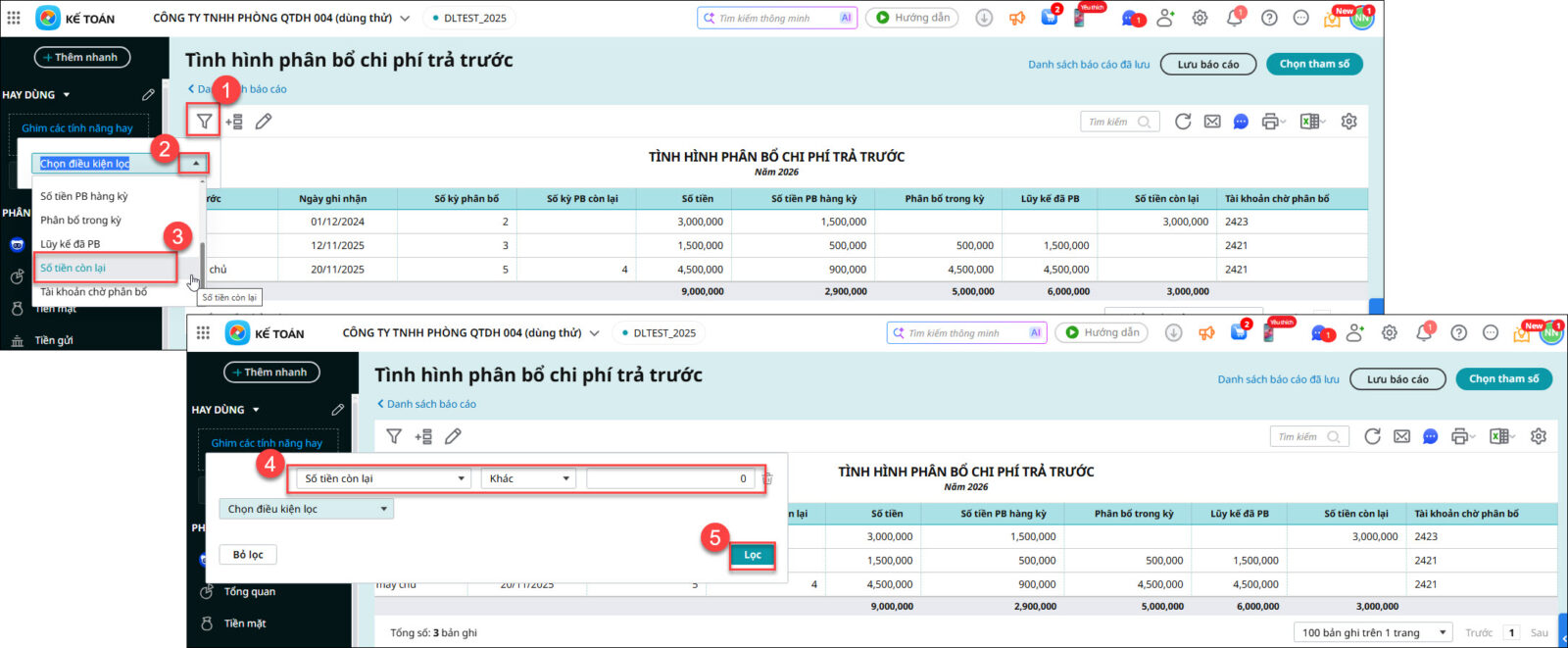 • Đối với báo cáo Tình hình phân bổ chi phí trả trước: nhấn vào biểu tượng hình phễu Lọc \ nhấn mũi tên Chọn điều kiện lọc là Số tiền còn lại \ chọn điều kiện lọc là Khác \ nhập giá trị lọc là 0 \ nhấn Lọc