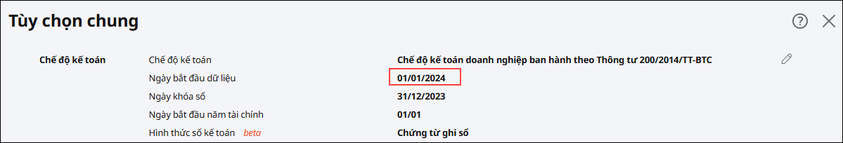 Giải pháp: Anh/chị kiểm tra Ngày bắt đầu dữ liệu bằng cách vào: Biểu tượng bánh răng ⚙ \ Các tiện ích và thiết lập \ Tùy chọn \ Tùy chọn chung