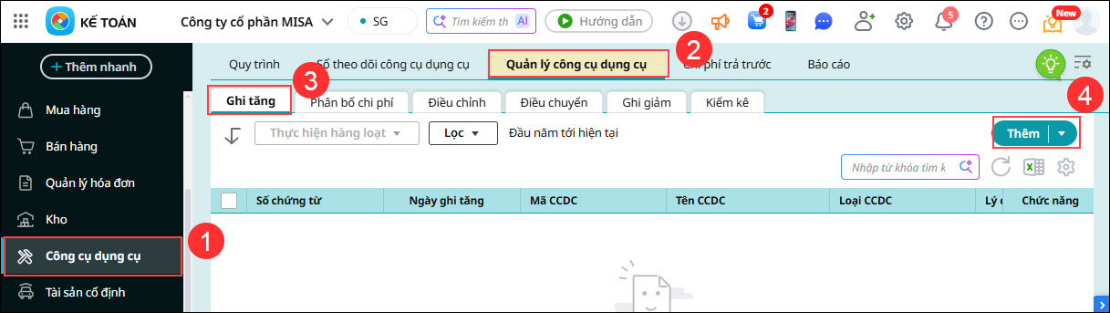 Bước 1: Vào phân hệ Công cụ dụng cụ \ tab Quản lý công cụ dụng cụ