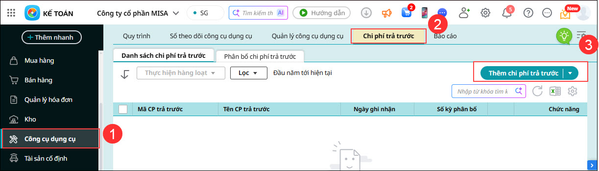 Bước 1: Vào phân hệ Công cụ dụng cụ / tab Quản lý công cụ dụng cụ hoặc tab Chi phí trả trước / tab Phân bổ chi phí