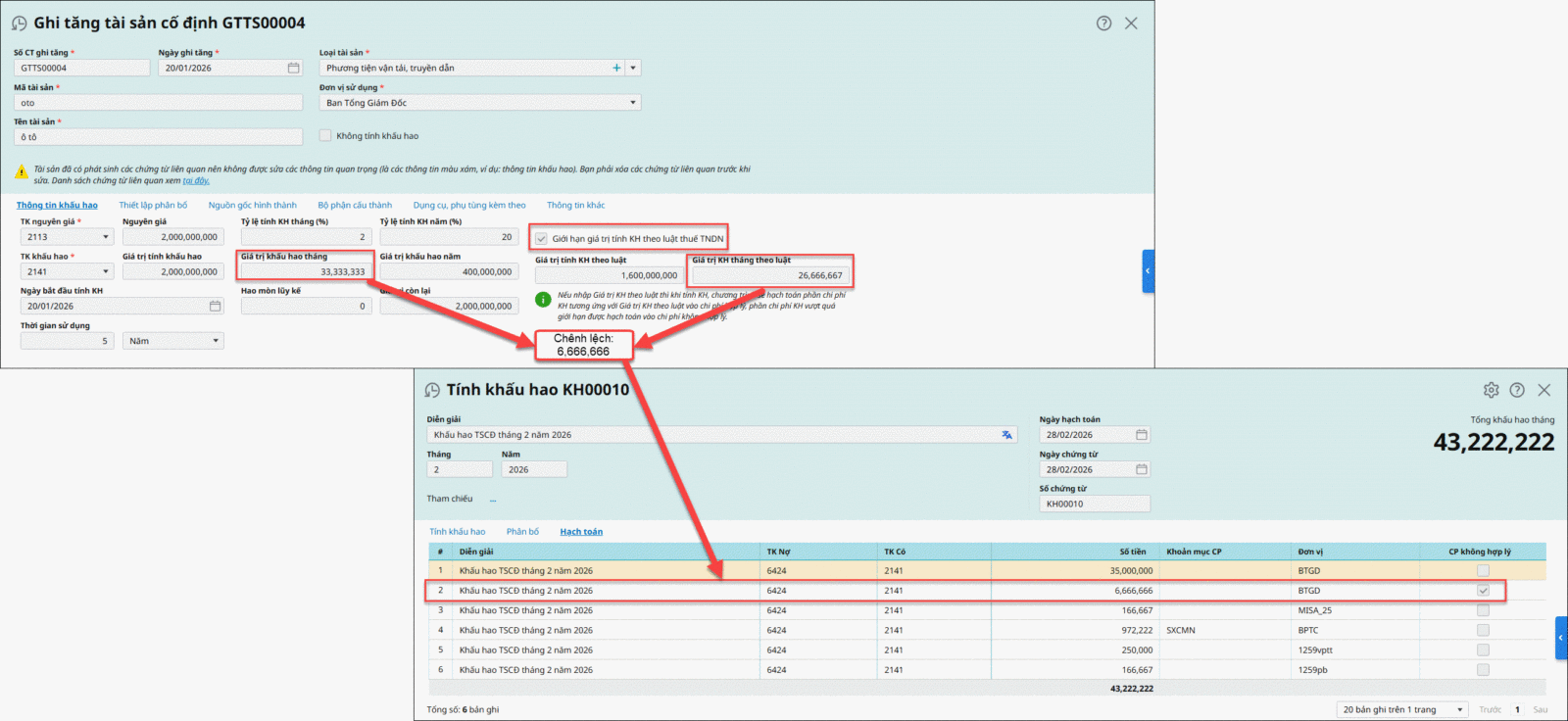 Câu hỏi 15: Kiểm tra chi phí khấu hao TSCĐ vượt quy định trên AMIS kế toán ở đâu?Vấn đề: Đối với các TSCĐ có giới hạn giá trị tính khấu hao theo quy định thuế TNDN, người dùng cần xác định phần chi phí khấu hao vượt mức (không hợp lý). Tuy nhiên, thông tin giới hạn này không hiển thị trực tiếp trên báo cáo mà chỉ xem được tại chứng từ ghi tăng tài sản, gây khó khăn khi kiểm tra. Giải pháp: Khi khai báo TSCĐ, nếu tích chọn Giới hạn giá trị tính KH theo luật thuế TNDN và nhập giá trị theo luật, thì khi tính khấu hao hàng tháng, phần chênh lệch giữa giá trị khấu hao hàng tháng và giá trị khấu hao theo luật (nếu > 0) sẽ được xác định là chi phí không hợp lý Cách kiểm tra: