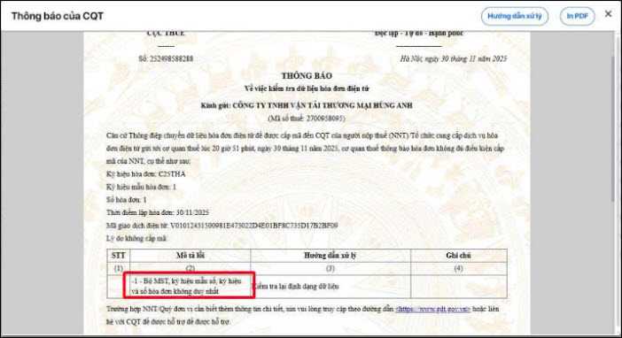 Nguyên nhân: Do lỗi từ CQT trả sai thông điệp