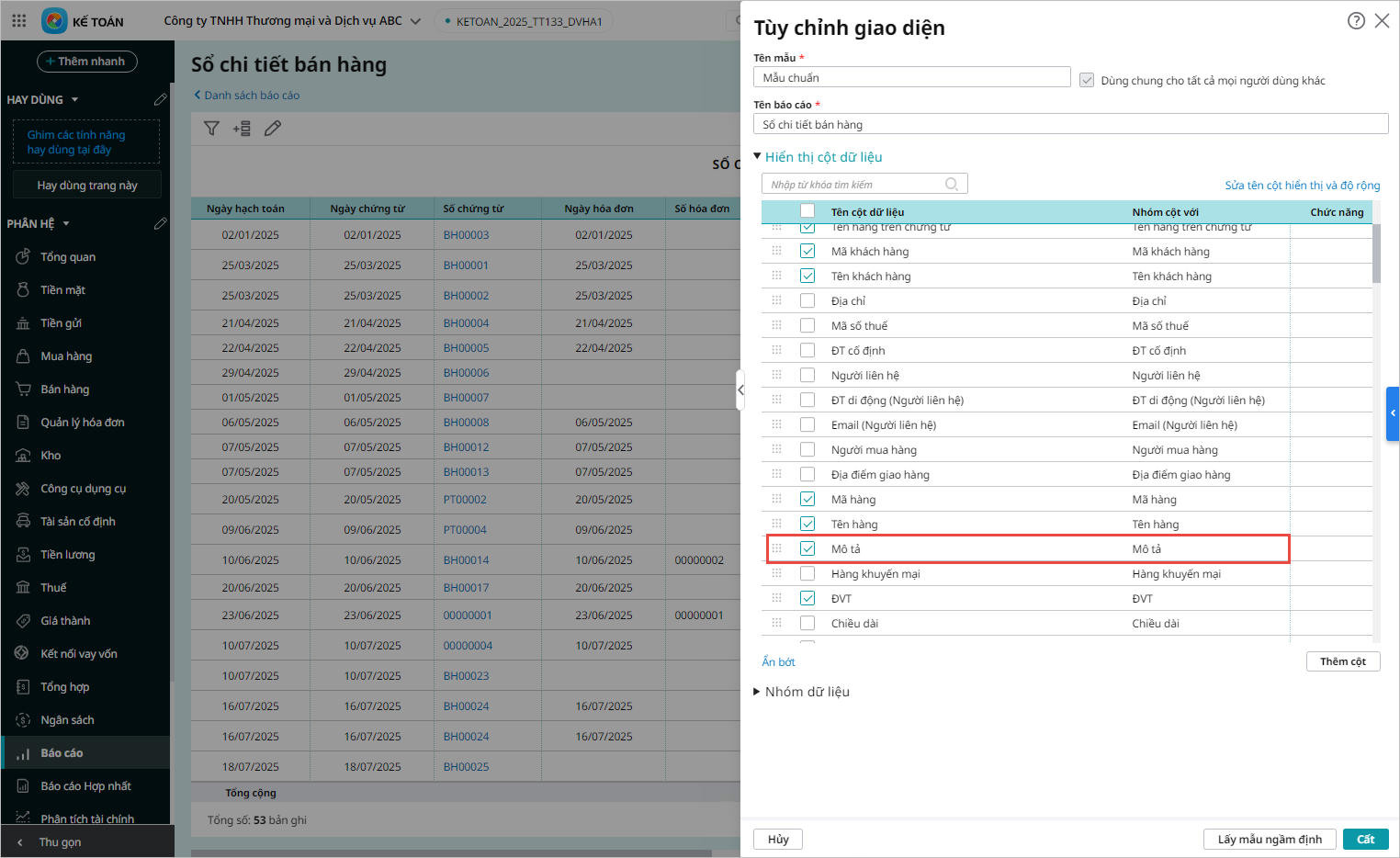 1. Trên báo cáo Sổ chi tiết bán hàng bổ sung trường Mô tả để người dùng có thể nhập liệu các thông tin liên quan đến nghiệp vụ kinh tế phát sinh: