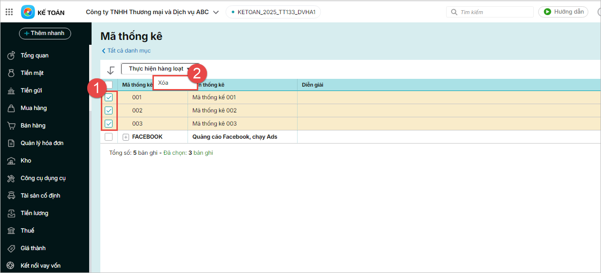 4. Bổ sung chức năng Xóa hàng loạt mã thống kê: Cho phép người dùng chọn nhiều mã thống kế để xóa cùng lúc giúp tiết kiệm thời gian xóa từng mã thống kê trong trường hợp danh sách thống kê có sự thay đổi cần cập nhật lại: