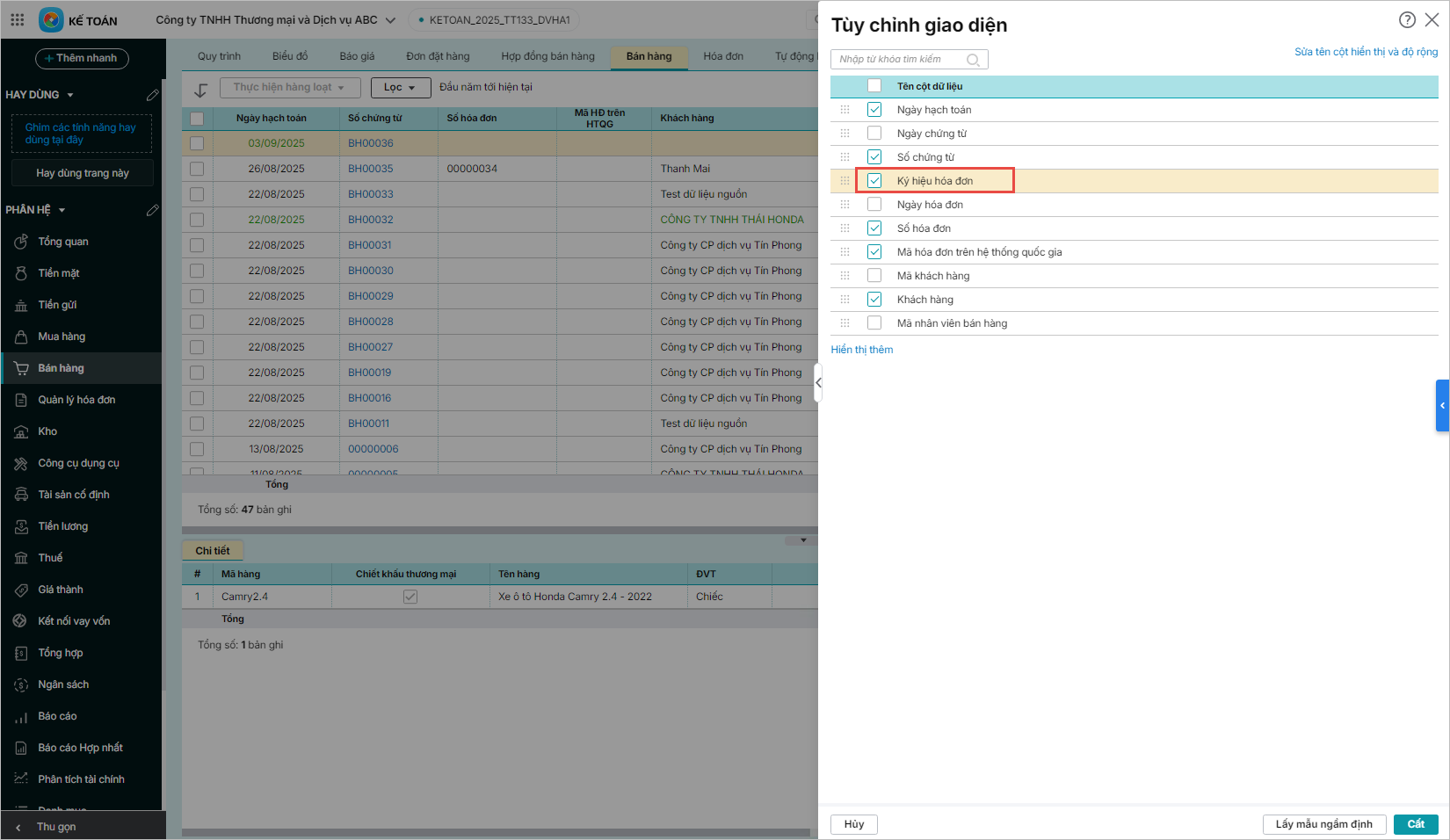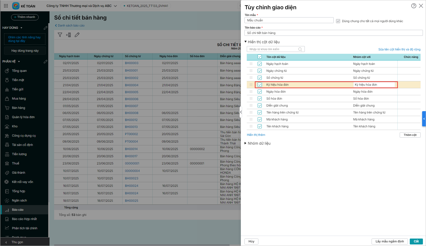 4. Trên báo cáo Sổ chi tiết bán hàng và danh sách chứng từ bán hàng bổ sung thông tin ký hiệu hóa đơn, giúp người dùng nhanh chóng xem được doanh thu lọc theo ký hiệu hóa đơn: