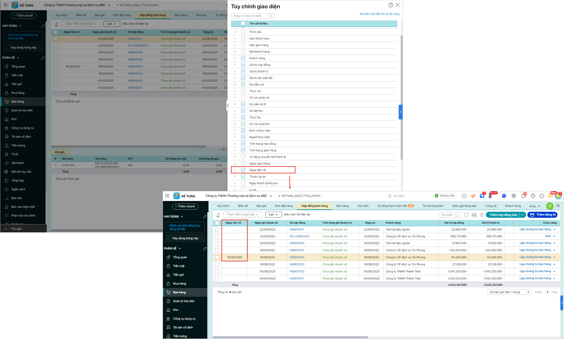 - Trên danh sách hợp đồng bán hàng bổ sung thông tin Ngày tiền về để đáp ứng nhu cầu của đơn vị và tiết kiệm thời gian làm báo cáo: