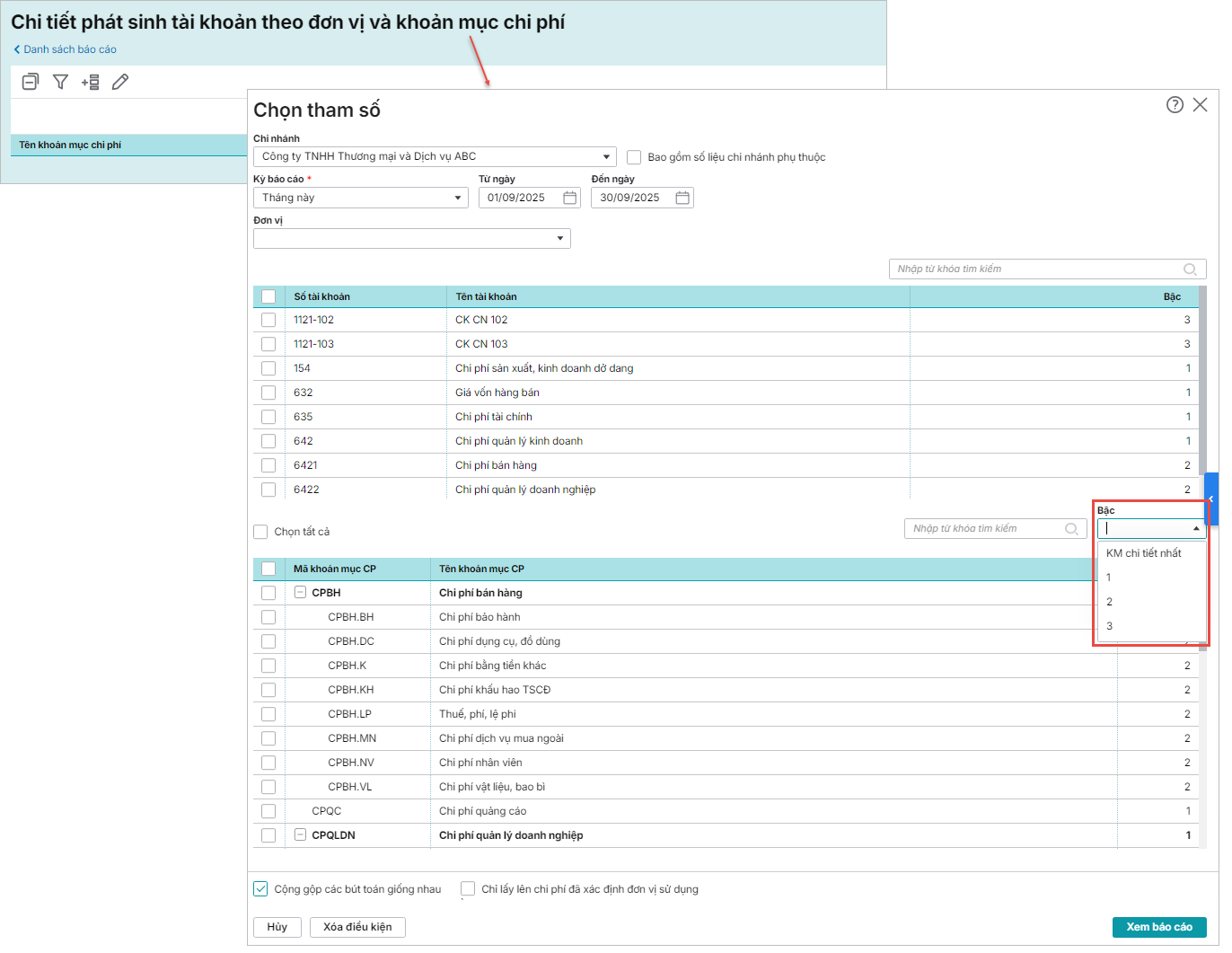 5. Trên giao diện thiết lập tham số báo cáo Chi tiết phát sinh tài khoản theo đơn vị và khoản mục chi phí bổ sung thêm tham số Bậc của khoản mục chi phí, hỗ trợ người dùng xem báo cáo nhanh chóng hơn: