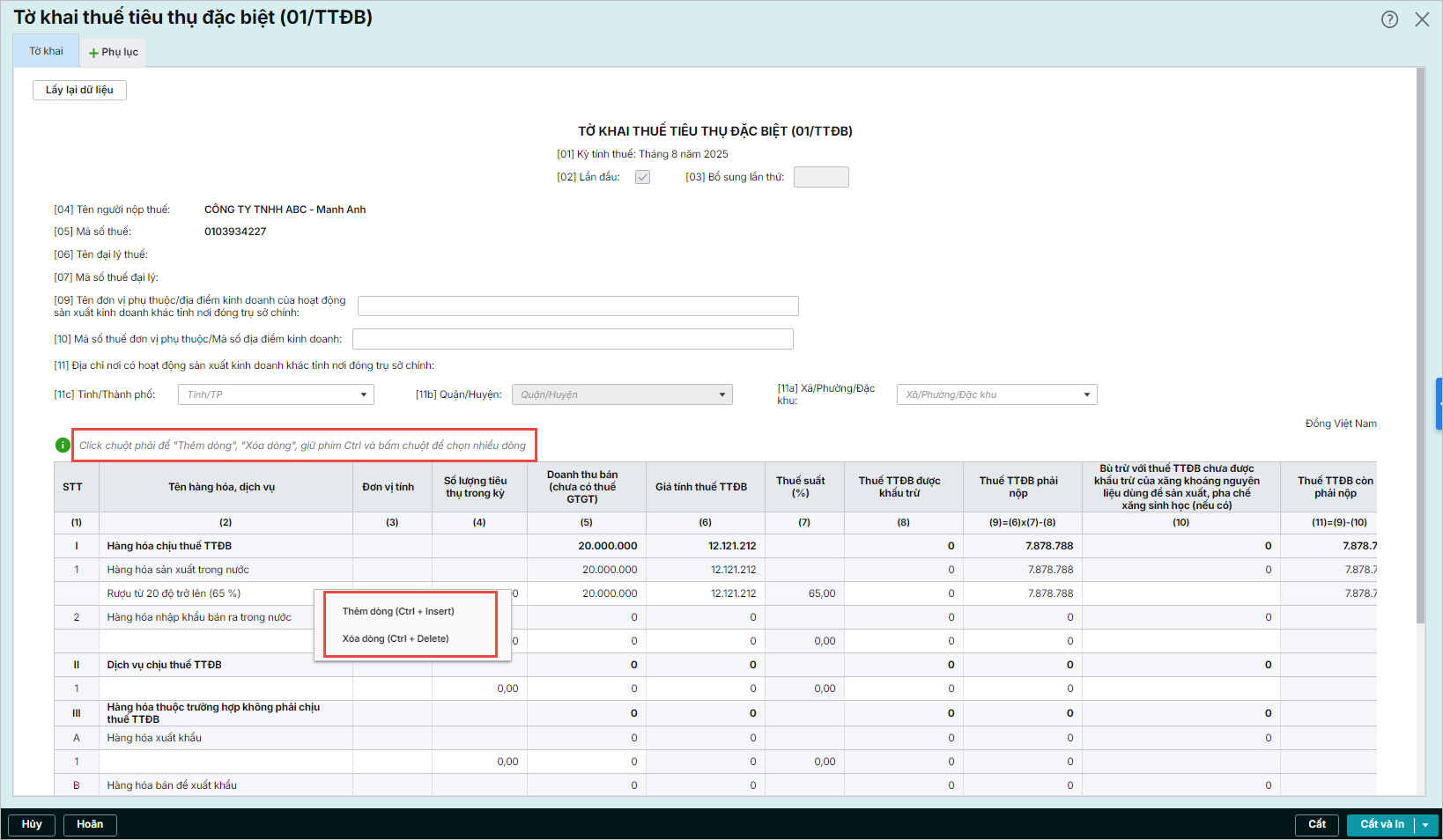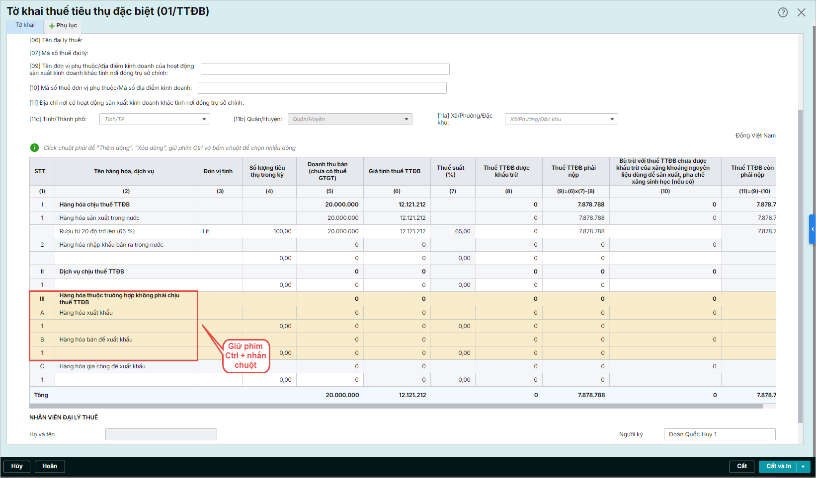 6. Trên tờ khai thuế TTĐB bổ sung chức năng Thêm dòng/Xóa dòng; Chọn nhiều dòng và bổ sung Text hướng dẫn để người dùng nhanh chóng nắm được. Trong đó: