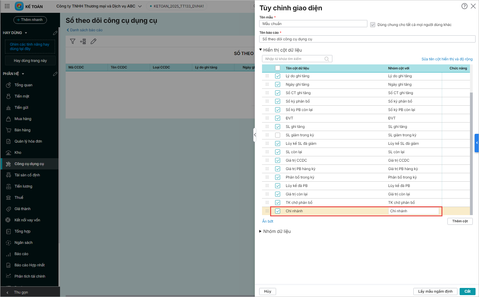 10. Trên báo cáo Sổ theo dõi CCDC bổ sung cột chi nhánh để người dùng nhanh chóng nắm được CCDC thuộc chi nhánh nào: