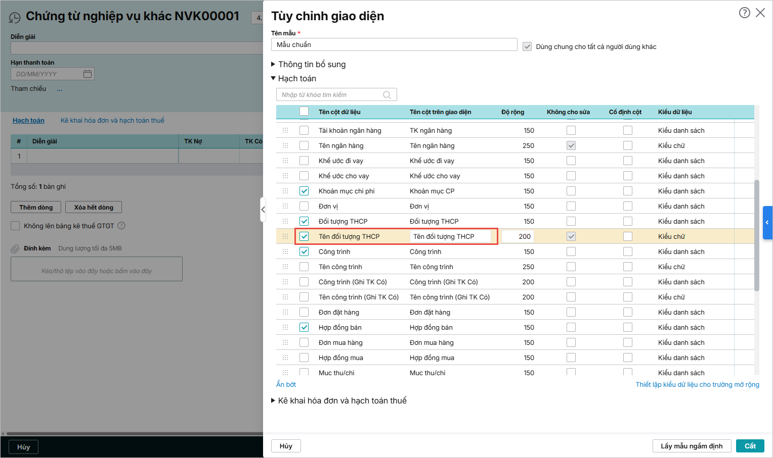 12. Bổ sung thông tin Tên đối tượng THCP trên chi tiết các chứng từ sau: (Lưu ý: Người dùng cần thực hiện tùy chỉnh giao diện để hiển thị thông tin Tên đối tượng THCP):