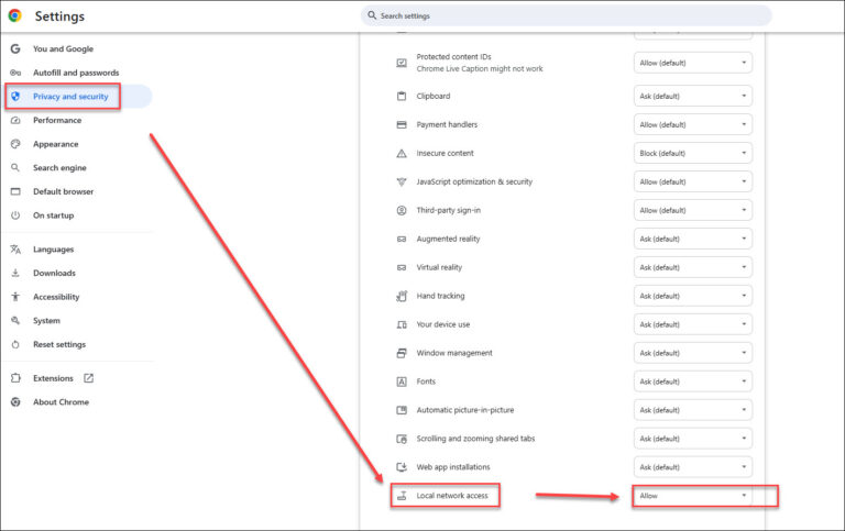 Chọn site Settings → Tìm tới mục Local Network Access ở cuối → Mở Allow hoặc cho phép.