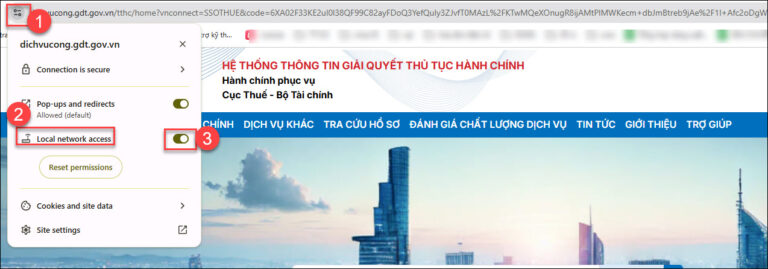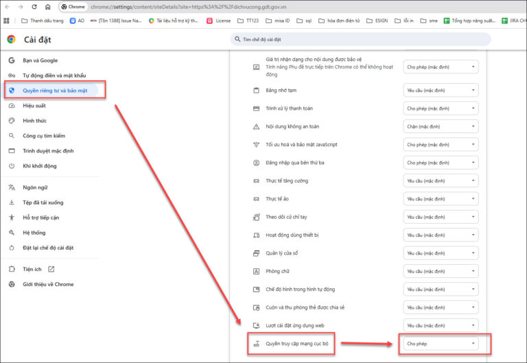 Vào web trình duyệt ở góc trái phía trên link trang đường dẫn, tại dòng Local network acess (Quyền riêng tư và bảo mật) tích biểu tượng cho phép