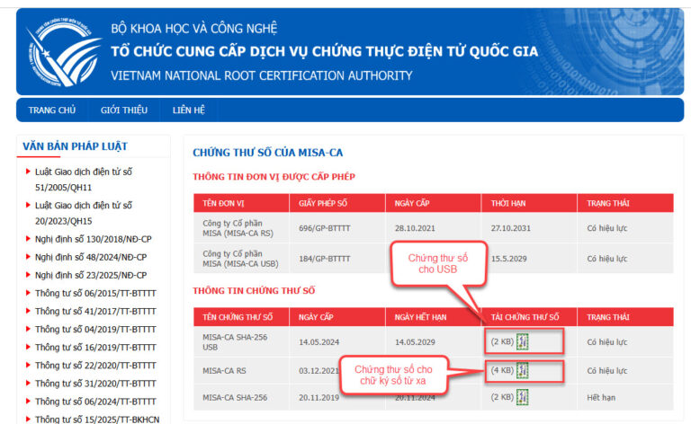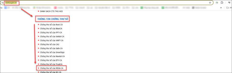 • Bước 2: Truy cập trang https://rootca.gov.vn/ kéo xuống cuối mục Thông tin chứng thư số, kích vào dòng Chứng thư số của MISA-CA