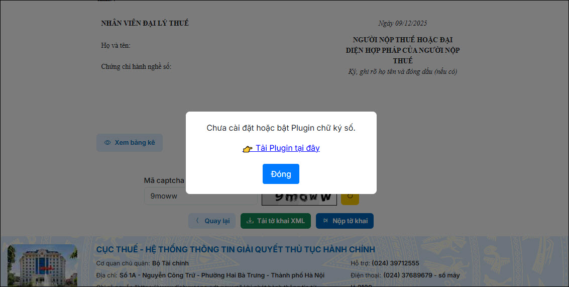 Khi nộp tờ khai báo lỗi “Chưa cài đặt hoặc bật Plugin chữ ký số” như hình sau: