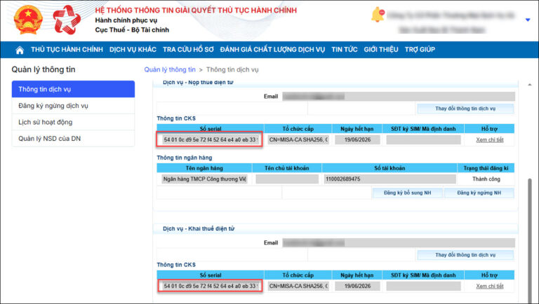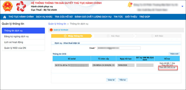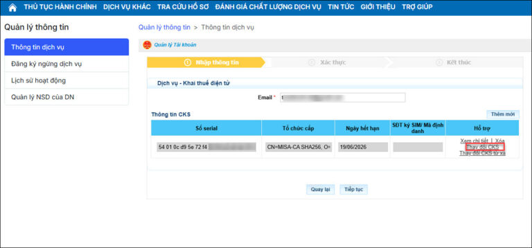 Lưu ý: Trường hợp kiểm tra thông tin đúng mà hệ thống vẫn báo lỗi Chứng thư số chưa được đăng ký, vẫn thực hiện thay đổi thông tin dịch vụ để hệ thống cập nhật.