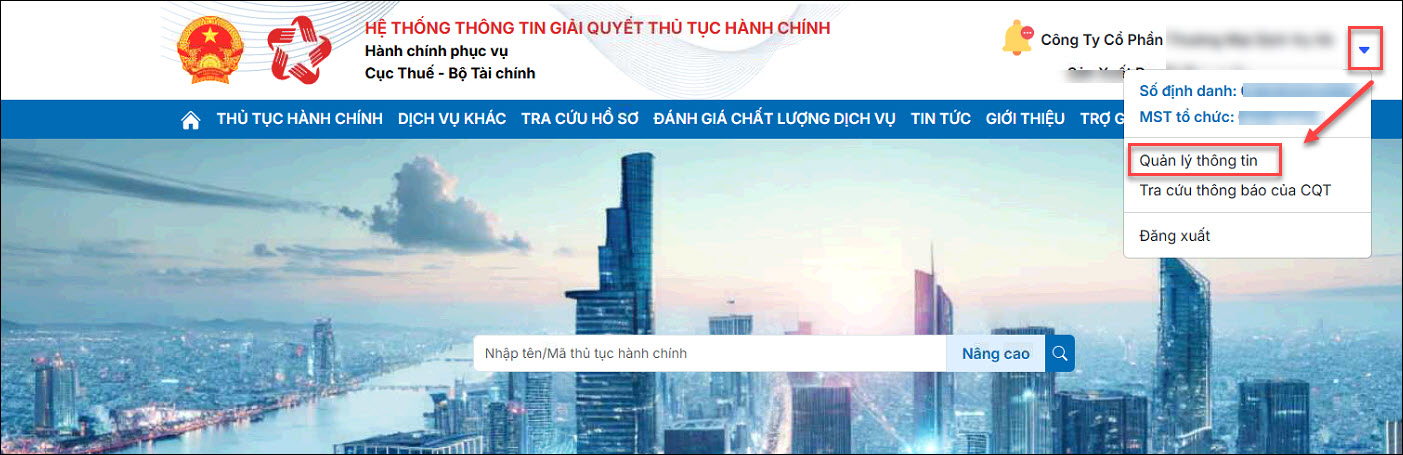 • Bước 2: Sau khi đăng nhập nhấn vào mũi tên góc bên phải trên cùng cạnh tên đơn vị, chọn Quản lý thông tin
