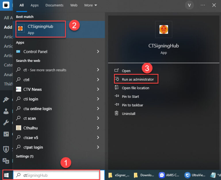 Vào mục Start, tìm kiếm gõ CTSigningHub, chọn Run as administrator