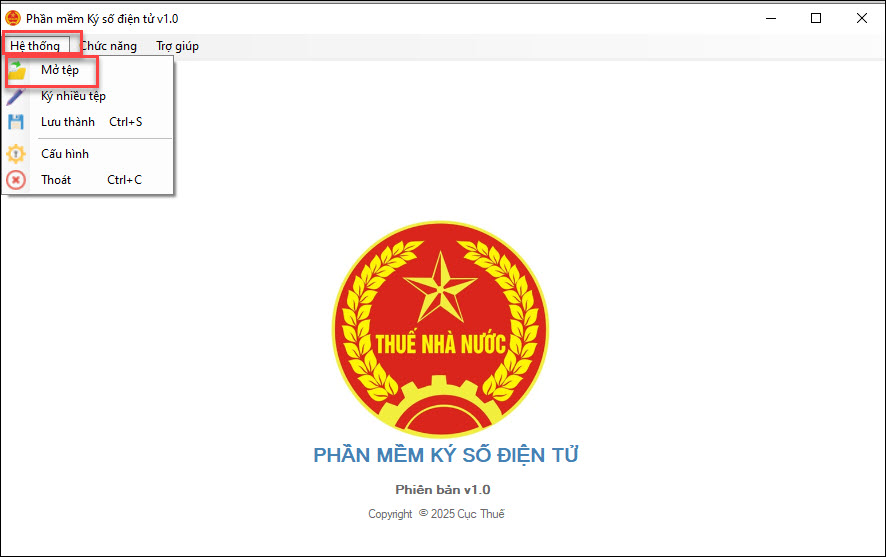 Bước 4: Tại giao diện phần mềm ký số vào Hệ thống, chọn Mở tệp, chọn file cần ký số