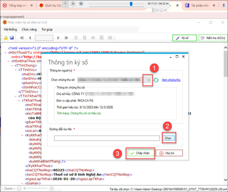 Bước 6: Tích chọn Chứng thư sốĐường dẫn lưu file rồi nhấn Chấp nhận để thực hiện ký số