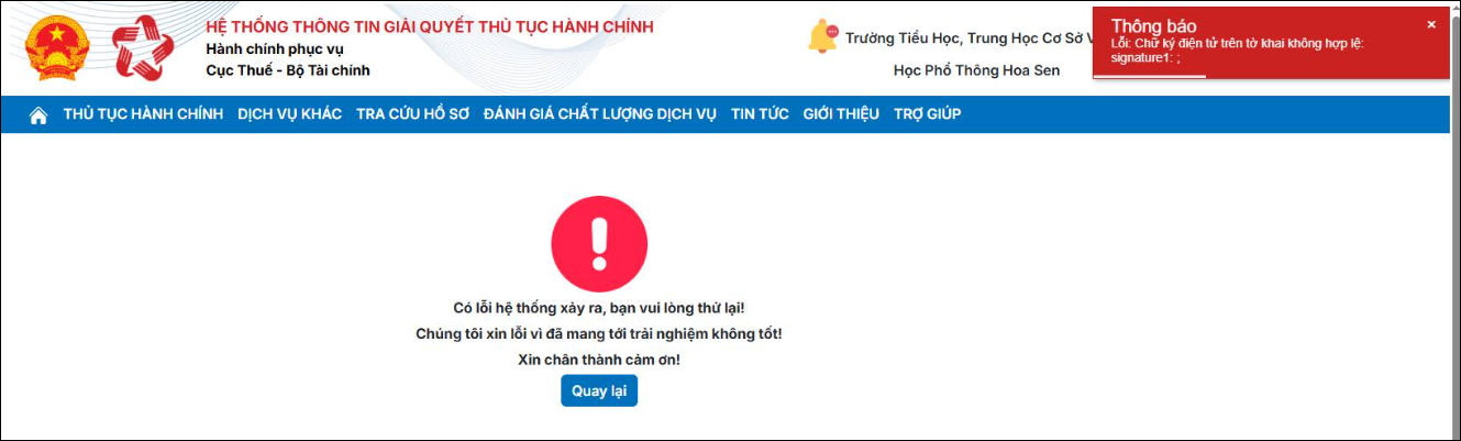 Khi nộp tờ khai báo lỗi “Chữ ký điện tử trên tờ khai không hợp lệ”