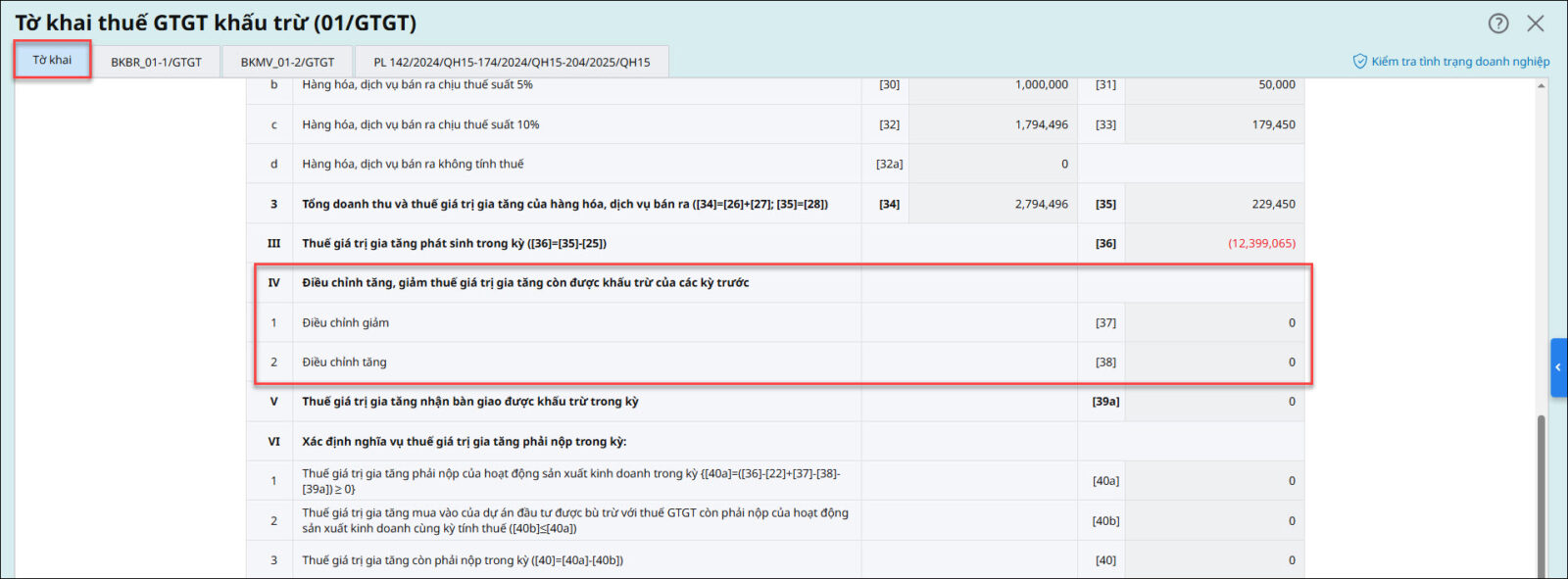 - Chỉ tiêu 38: Điều chỉnh tăng thuế GTGT còn được khấu trừ của các kỳ trước.