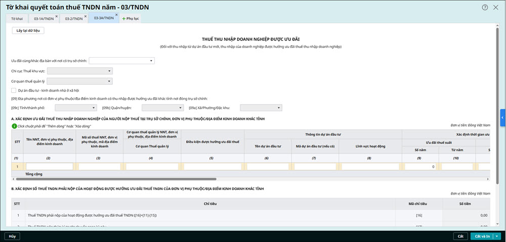 - Phụ lục 03-3A/TNDN: Thuế TNDN được ưu đãi.