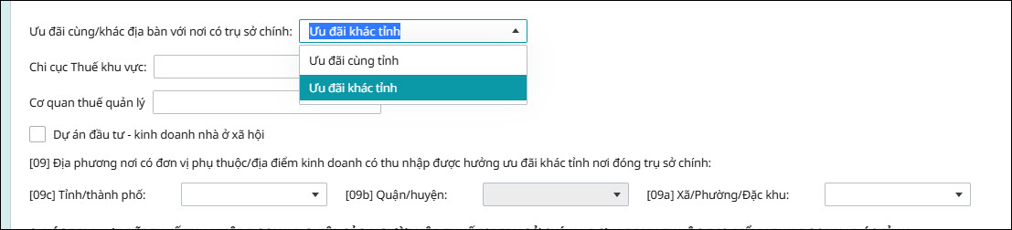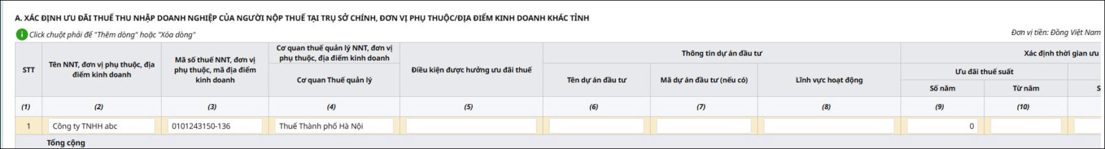 Phần A. Xác định ưu đãi thuế thu nhập doanh nghiệp của người nộp thuế tại trụ sở chính, đơn vị phụ thuộc/địa điểm kinh doanh: NNT kê khai theo từng trường hợp được hưởng ưu đãi thuế TNDN bao gồm ưu đãi thuế TNDN của NNT tại trụ sở chính/đơn vị phụ thuộc/địa điểm kinh doanh cùng tỉnh với trụ sở chính, và ưu đãi thuế TNDN của đơn vị phụ thuộc/địa điểm kinh doanh khác tỉnh.