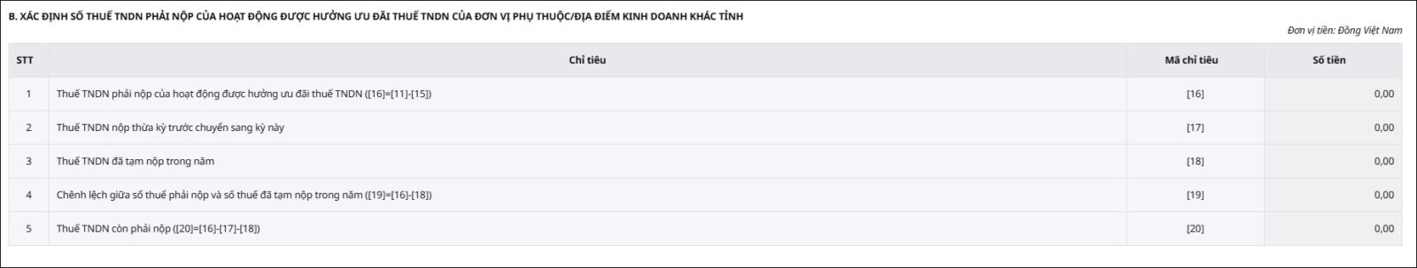 Phần B. Xác định số thuế TNDN phải nộp của hoạt động được hưởng ưu đãi thuế TNDN của đơn vị phụ thuộc/địa điểm kinh doanh khác tỉnh. NNT không phải kê khai mục B nếu hoạt động được hưởng ưu đãi thuế TNDN cùng tỉnh với nơi có trụ sở chính.