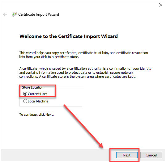 Bước 2: Tích chọn Current User nhấn Next Chọn Place all certificates in the following store => Browse => Trusted root certificate Authorities => OK và chọn Next