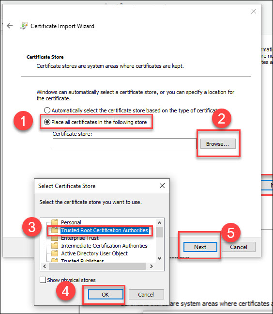 Bước 3: Chọn Place all certificates in the following store => Browse => Trusted root certificate Authorities => OK và chọn Next