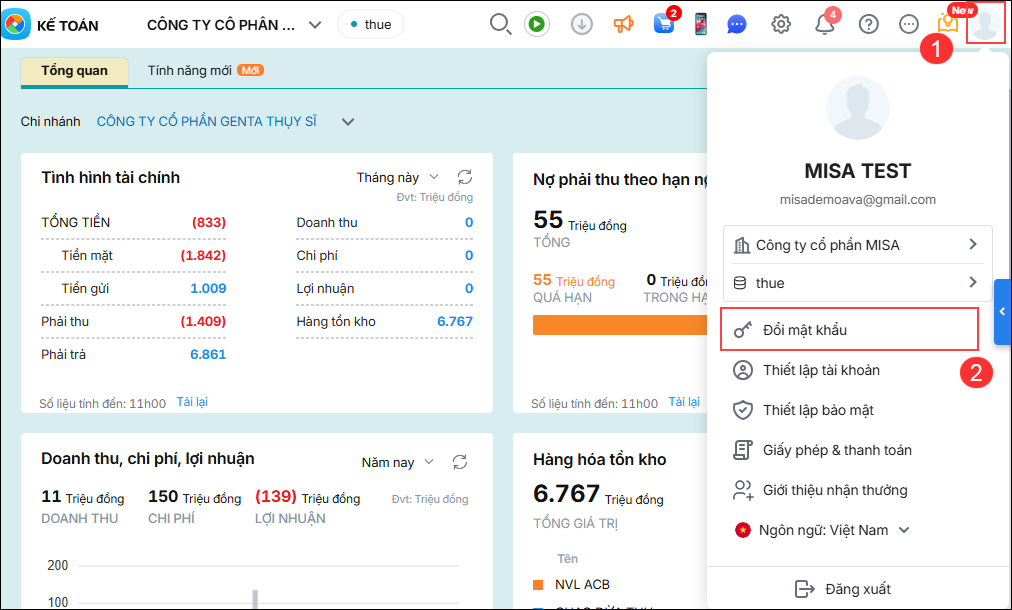 Bước 5: Nhấn Tạo mật khẩu. Bước 6: Đăng nhập lại AMIS với Mật khẩu vừa tạo. – Trường hợp 2: Đổi mật khẩu mới Bước 1: Nhấn vào ảnh đại diện người dùng ở góc phải trên, chọn Đổi mật khẩu