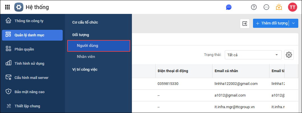Bước 2: Chọn phân hệ Quản lý danh mục\Người dùng