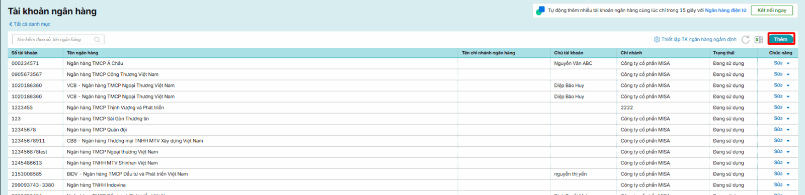 Bước 2: Tại màn hình danh sách tài khoản ngân hàng, chọn chức năng Thêm trên thanh công cụ.