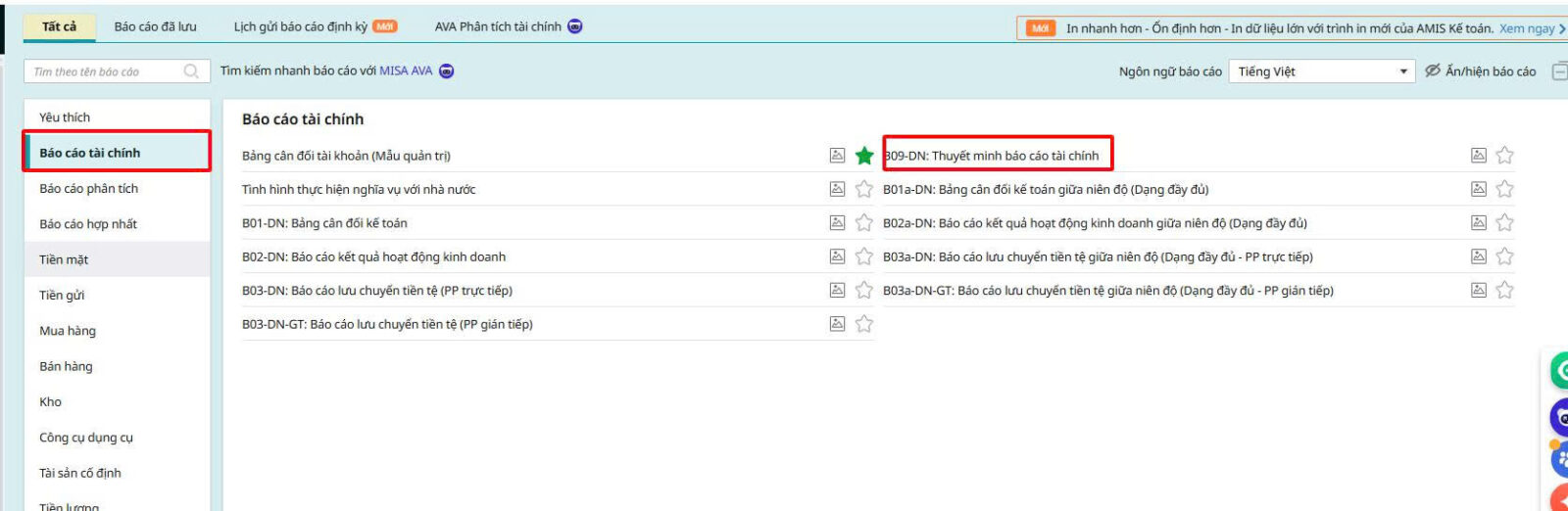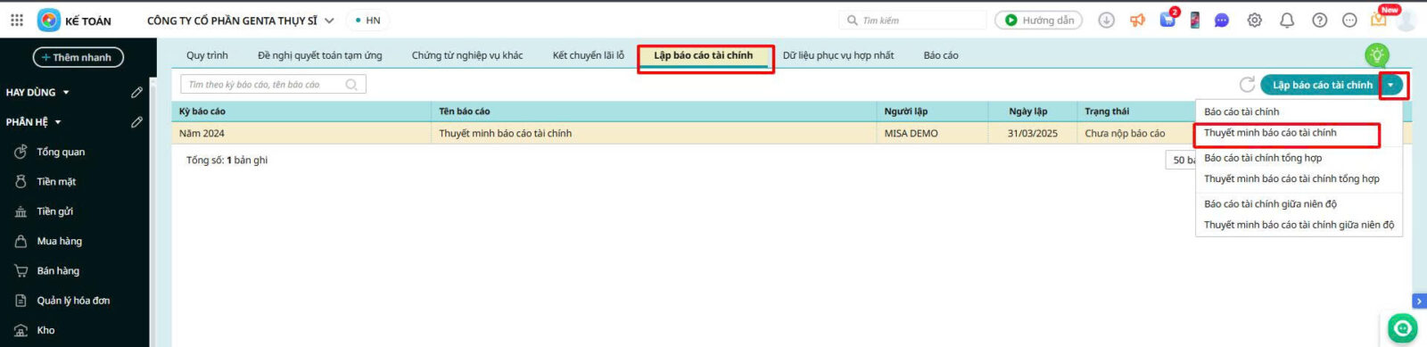 Bước 1: Tại phân hệ Báo cáo\ Báo cáo tài chính\ Thuyết minh báo cáo tài chính