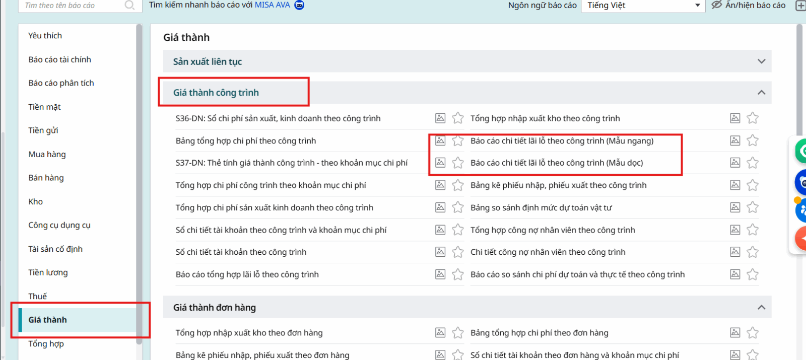 Bước 1: Mở báo cáo chi tiết lãi lỗ theo công trình: