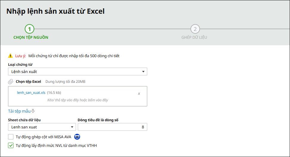 Bước 3: Chương trình tự động ghép các cột dữ liệu trên phần mềm với các cột tương ứng trong tệp Excel.