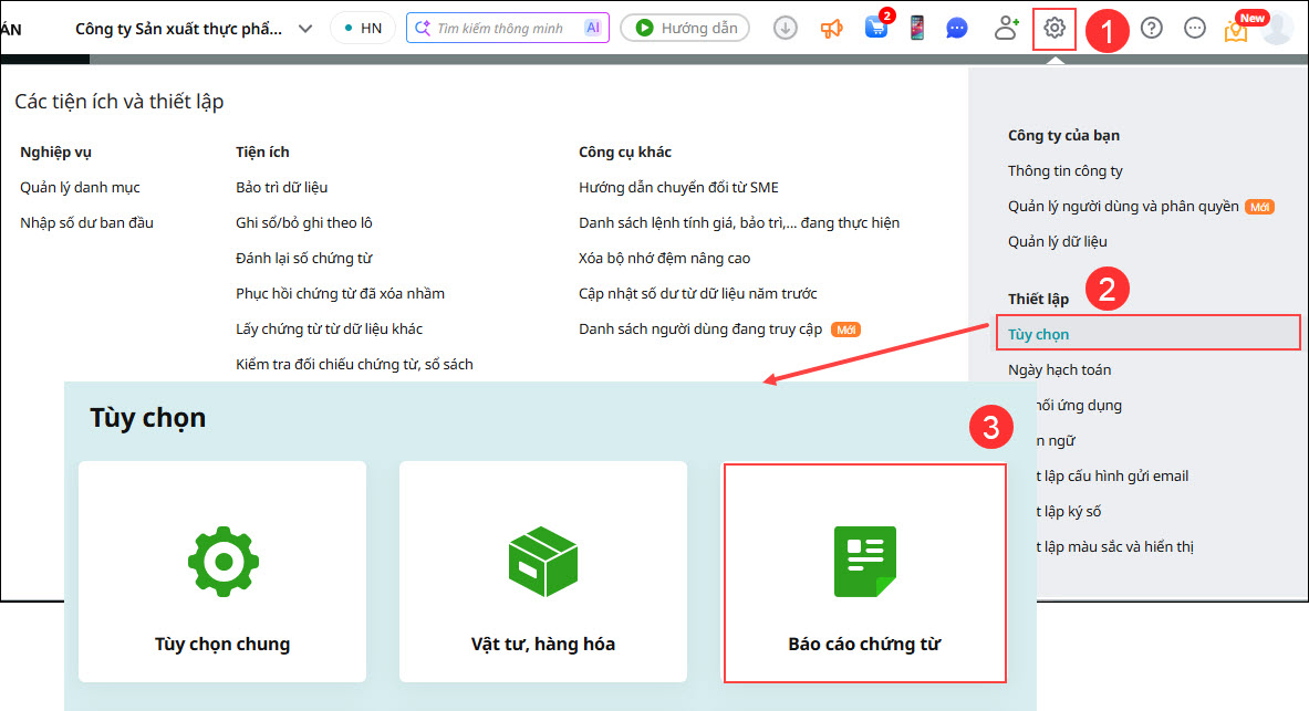 Bước 2: Tại màn hình Tùy chọn, chọn mục Báo cáo chứng từ