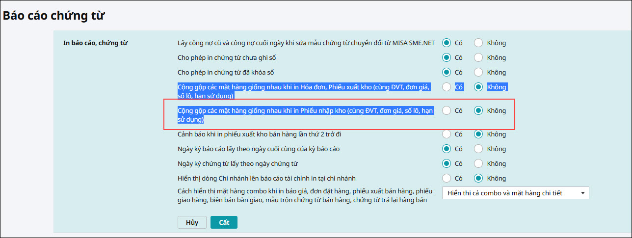 • Chọn Có: Khi in Phiếu nhập kho các mặt hàng có cùng ĐVT, đơn giá, số lô, hạn sử dụng sẽ được cộng gộp thành một dòng trên chứng từ in. Khi đó chứng từ sẽ không hiển thị chi tiết từng dòng hàng hóa phát sinh.
