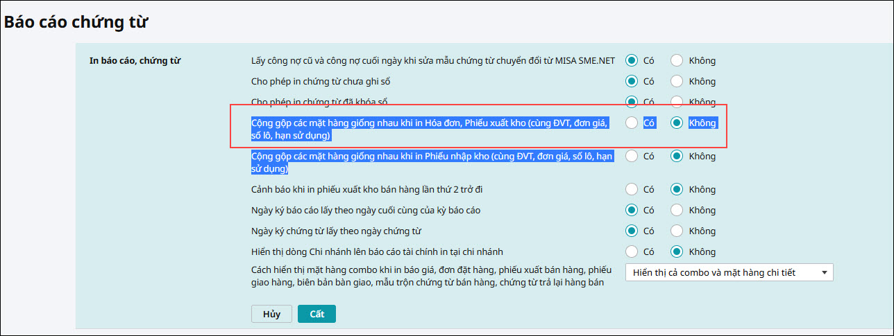 • Chọn Có: Khi in Hóa đơn, Phiếu xuất kho, các mặt hàng có cùng ĐVT, đơn giá, số lô, hạn sử dụng sẽ được cộng gộp thành một dòng trên chứng từ in. Khi đó chứng từ sẽ không hiển thị chi tiết từng dòng hàng hóa phát sinh.