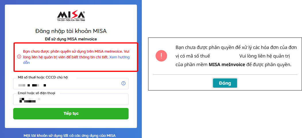 - “Bạn chưa được phân quyền sử dụng trên MISA meInvoice. Vui lòng liên hệ quản trị viên để biết thông tin chi tiết.”