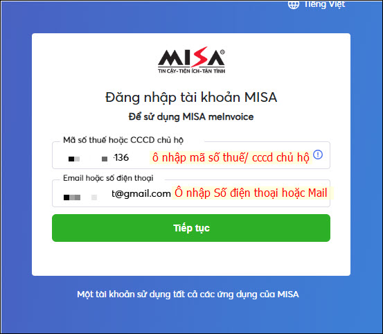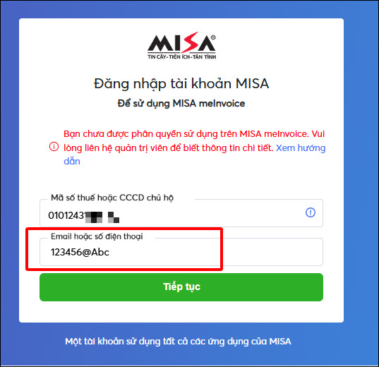 Nguyên nhân 2: Do nhập nhầm thứ tự các ô thông tin đăng nhậpNguyên nhân: Nhập nhầm thứ tự thông tin đăng nhập ở các ô Ví dụ: Nhập đúng Mã số thuế nhưng nhập nhầm chỗ Email hoặc số điện thoại thành Mật khẩu đăng nhập nên phần mềm báo chưa được phân quyền