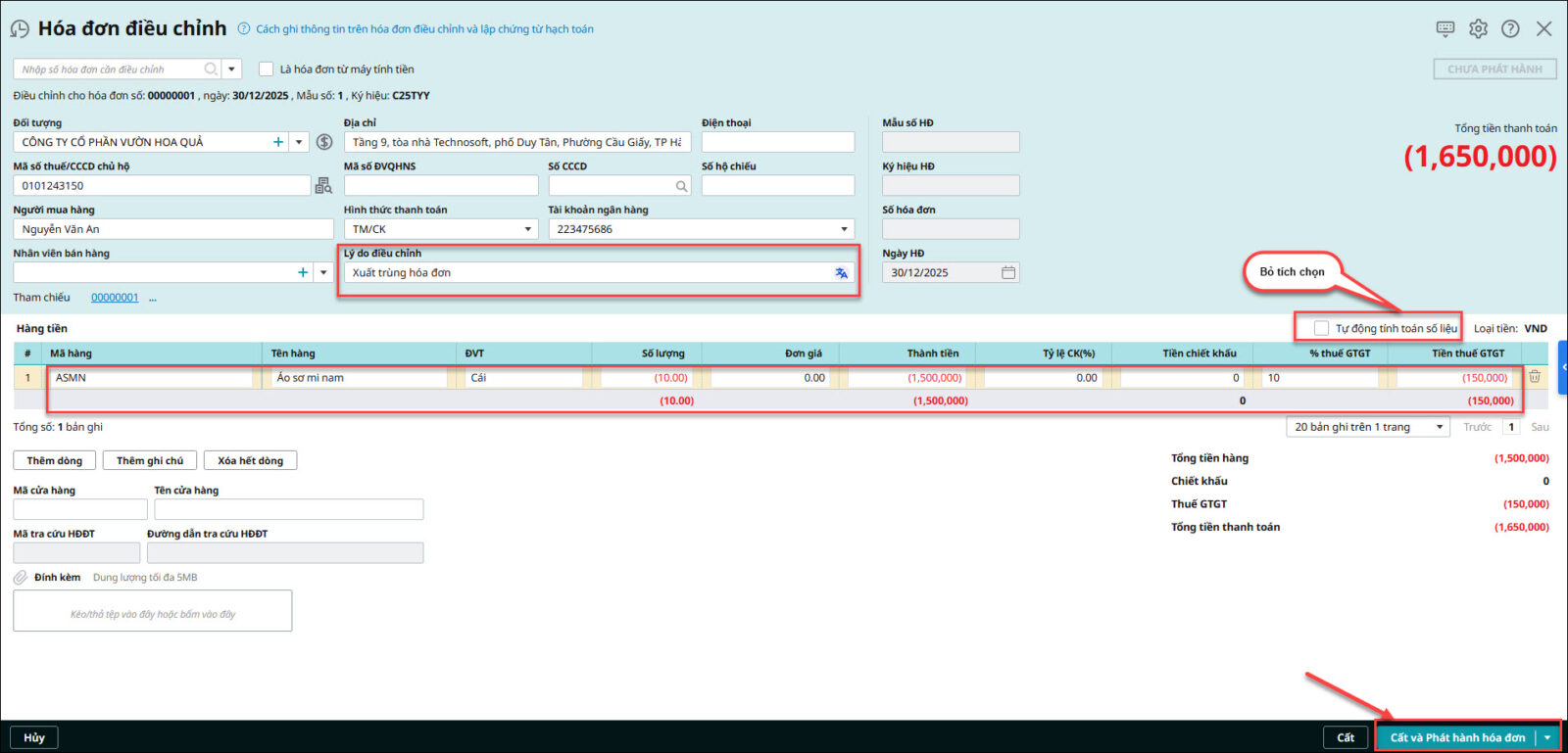 Giả sử đã xuất hóa đơn số 00000001, ký hiệu 1C25TYY ngày 30/12/2025 cho khách hàng, giá trị 1.650.000đ. Nay do xuất trùng, muốn điều chỉnh hóa đơn này về giá trị 0.