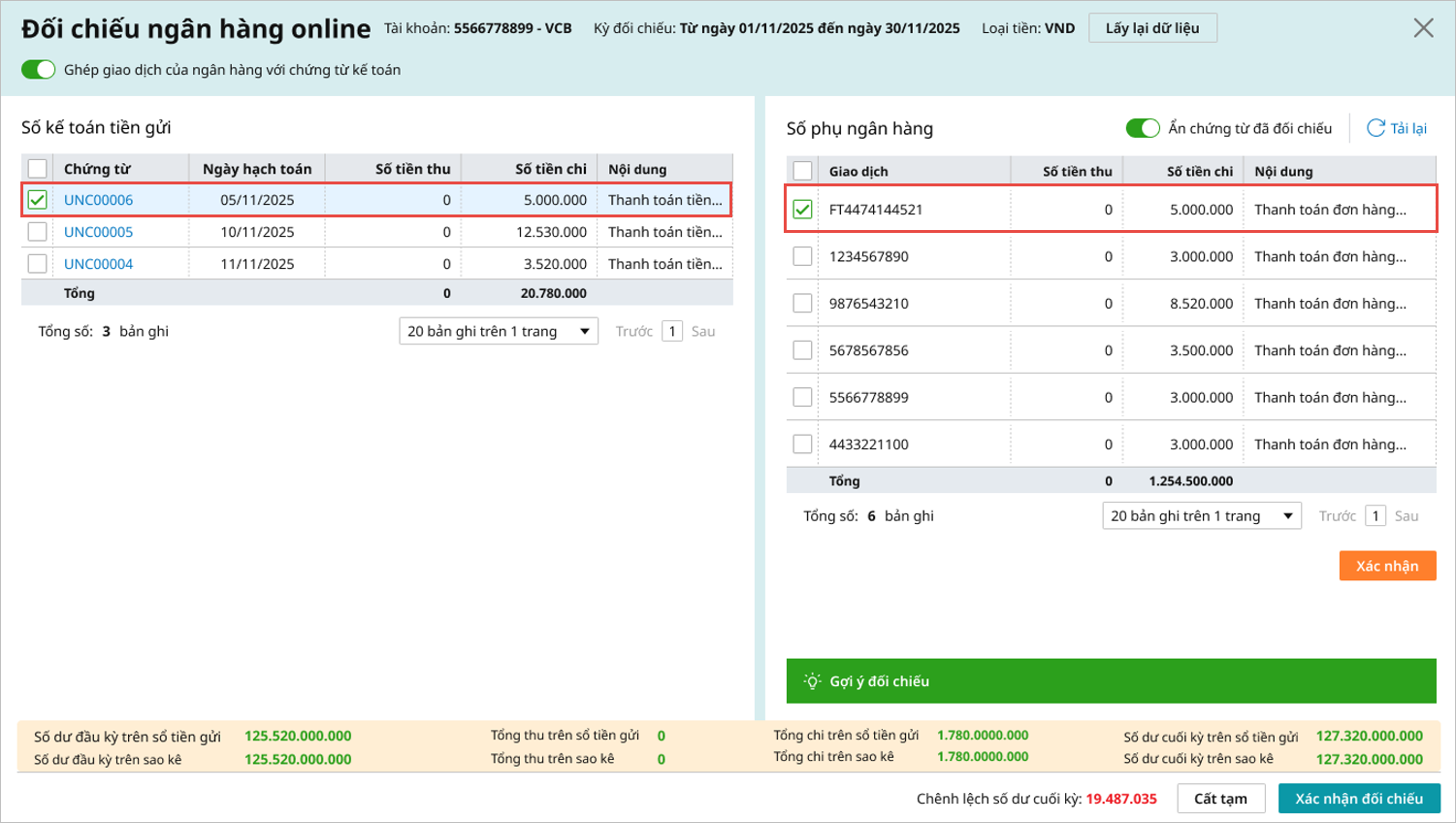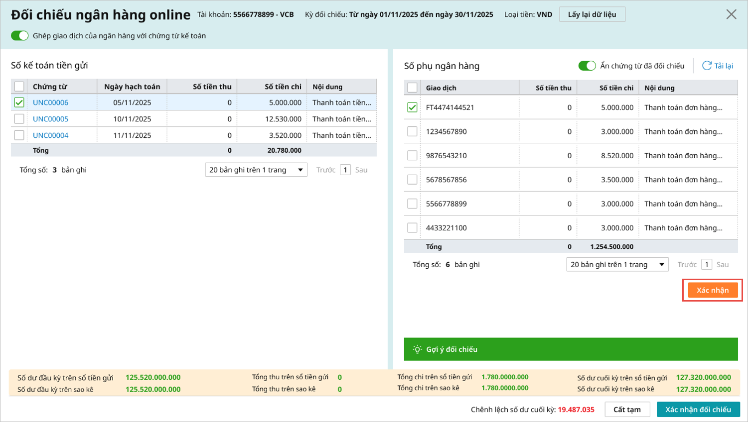 Bước 4: Sau khi kiểm tra xong chứng từ đối chiếu, nhấn Xác nhận. Bước 5: Nhấn Xác nhận đối chiếu