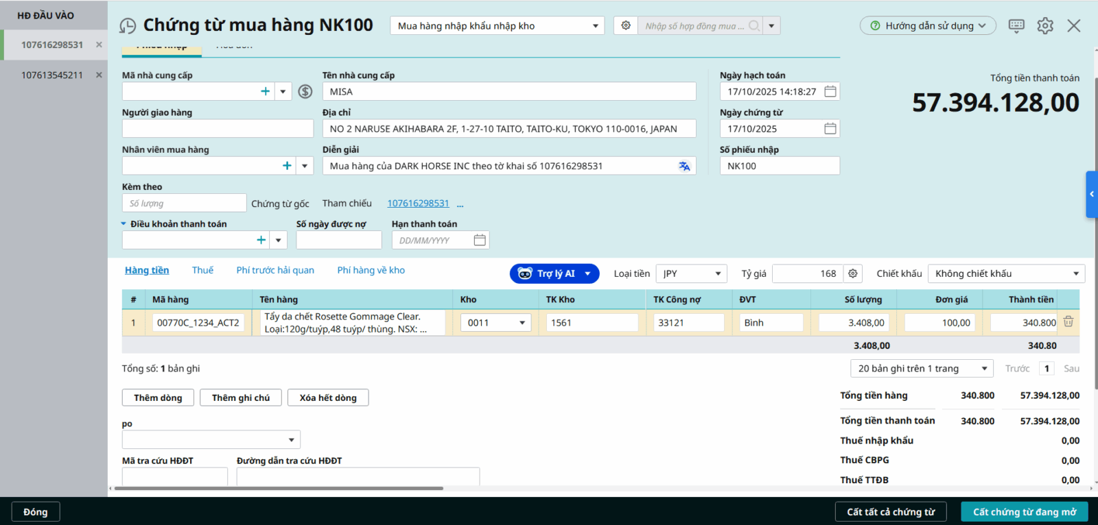 - Chương trình tự động lập chứng từ mua hàng nhập khẩu tương ứng: