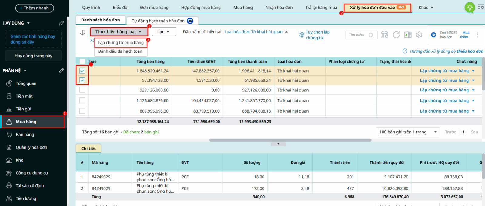 - Hoặc trên phân hệ Quản lý hóa đơn đầu vào, click chọn các hóa đơn cần lập chứng từ.