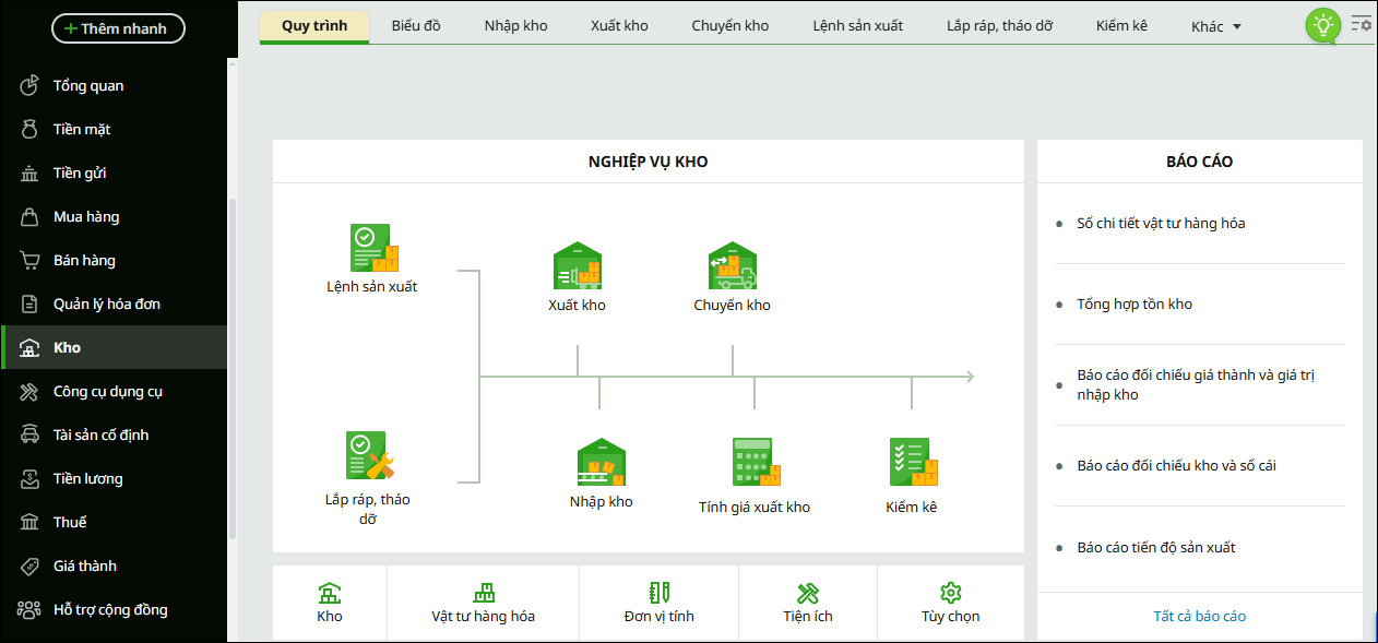 2.1 Quy trìnhHiển thị sơ đồ tổng quan nghiệp vụ Kho từ Lệnh sản xuất, Lệnh lắp ráp, tháo dỡ, Xuất kho, Nhập kho, Chuyển kho, Tính giá xuất kho, Thủ kho nhập/xuất kho (chỉ sử dụng khi Thủ kho có tham gia vào hệ thống), Kiểm kê, danh sách các báo cáo liên quan tới Kho và liên kết các nghiệp vụ liên quan Kho, Vật tư hàng hóa, Đơn vị tính, Tiện ích: Sắp xếp thứ tự chứng từ nhập xuất, Cập nhật giá nhập kho thành phẩm.